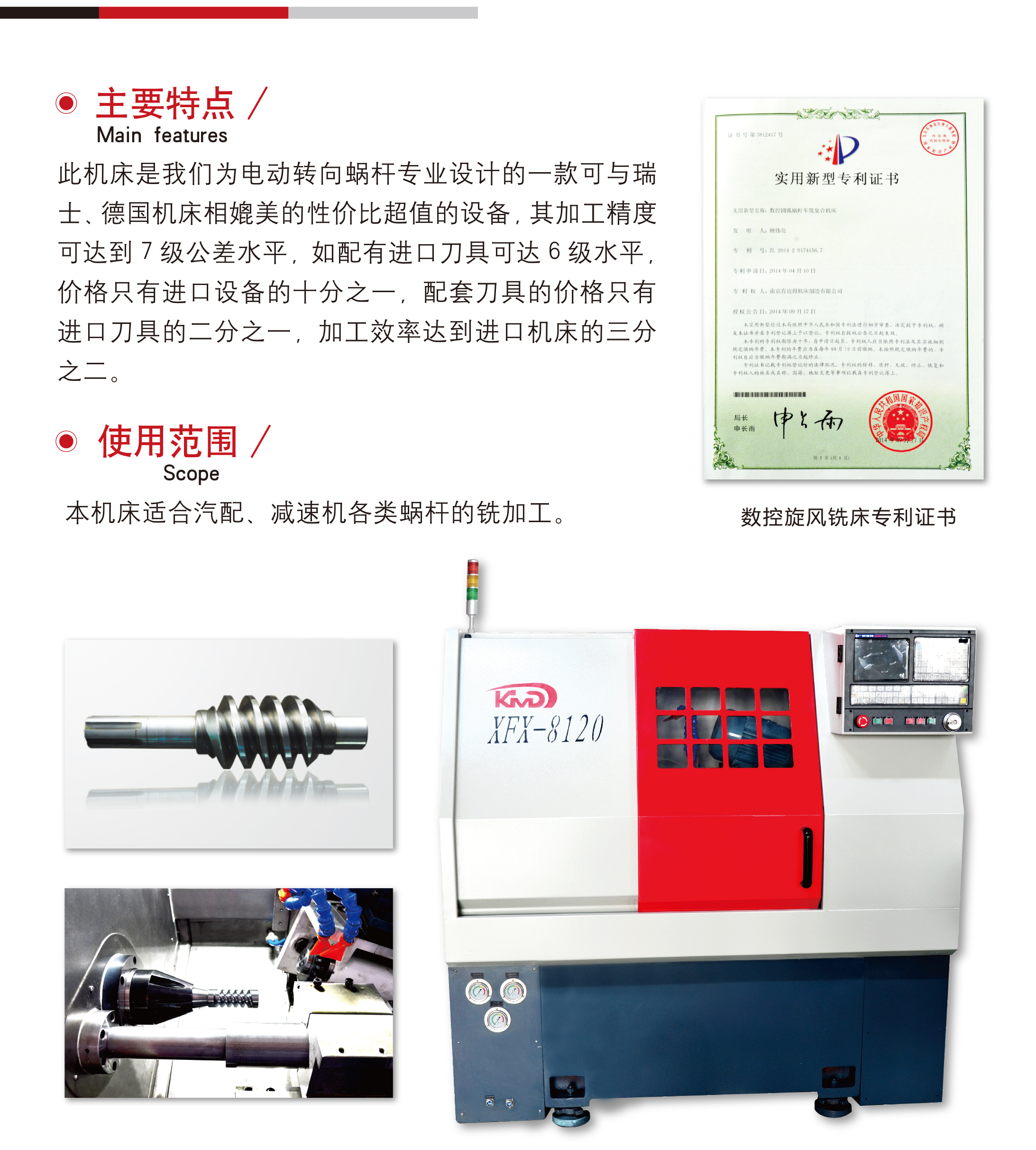 此機床是(shì)我們爲電(dian)動轉向蝸(wo)杆專業設(shè)計的一款(kuan)🌈具備瑞士(shì),德國機床(chuang)相媲美的(de)性價比超(chao)值的設備(bei),其加工精(jīng)度可達到(dào)7級公差水(shuǐ)平,如配有(you)進口刀具(jù)可達6級水(shui)平,價格隻(zhī)有進口設(she)備的十🈚分(fèn)之一,配套(tao)刀具的價(jia)🐇格隻有進(jin)口刀具的(de)二分之一(yi),加工效率(lǜ)達到進口(kou)機床的三(sān)分之二。
